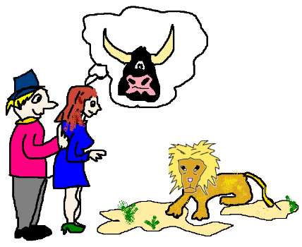 Herr Dummhausen besucht mit seiner Frau den Tierpark. Vor dem Raubtierkäfig sagt er zu ihr: ,, Was die Tiger wohl sagen würden, wenn sie sprechen könnten?" Antwortet sie: ,, Sie würden sagen: Wir sind Löwen und keine Tiger, du dummer Ochse." ![]() |